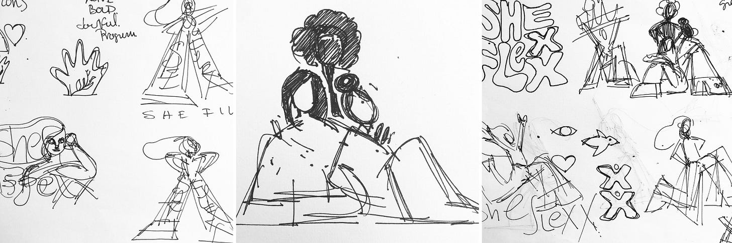 I found our designer Maria Loor on the website Women Who Draw, and from there went to her website where I was taken with her bold minimalist drawings of women, especially a drawing she did for International Women’s Day 2021. At our first meeting, I explained the SheFlexx project and brand essence, then enumerated a number of goals for the SheFlexx logo: that it have an element of illustration beyond a stylized lettering of the name; that it be clean and bold; that it invite as broad and diverse group of women as possible; and that it convey a sense of maturity. All told, a mighty tall order for a simple drawing! To my delight, Maria loved our mission and our name, was not daunted by my initial parameters, and jumped in with great enthusiasm, generating many sketches (below is but a sampling).